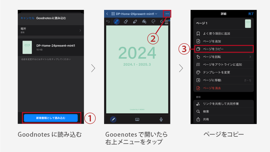 ①保存したファイル、もしくはStep.1-④から直接Goodnotesに読み込んで開きます。