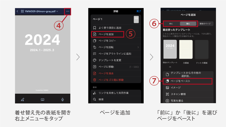 ⑦「ページをペースト」をタップ。先ほどコピーした新しい表紙が入り、古い表紙は削除して完了です。